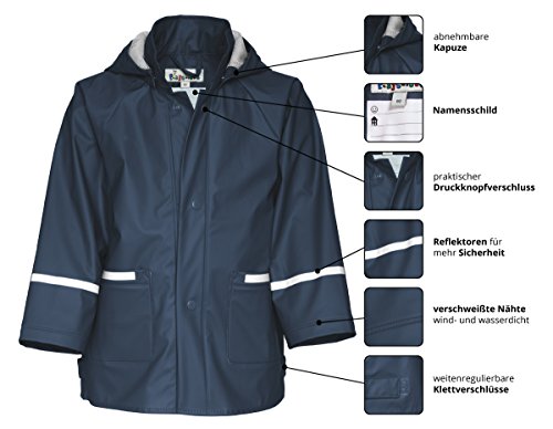 Met de chique regenkleding is spelen en rondlopen ook bij slecht weer veel plezier. De Buddel-jas is dankzij de gelaste naden wind- en waterdicht