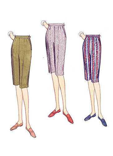 Shorts en getailleerde broeken (door de heup) hebben zijdelingse knoopsluiting, schuine zakken en ritssluiting aan de zijkant. b: drager ca. 1960 Stoffen: linnen, madras, pique, denim, popeline, flanel. Niet geschikt voor duidelijke diagonalen. Opmerkingen: A, B, C, D: een 7-ritssluiting, een 5/8(1,5 cm) knop, naadbinding.