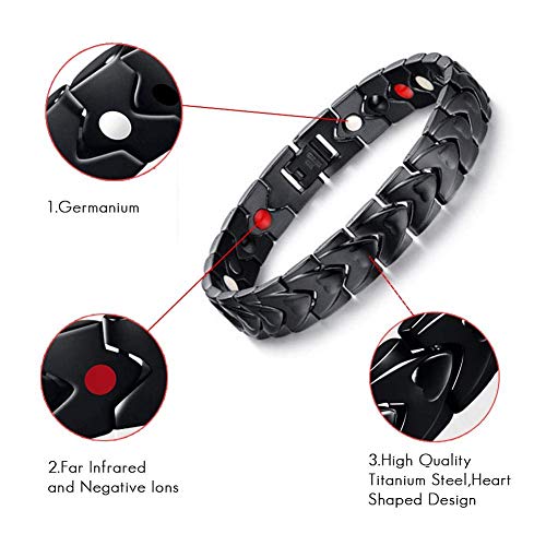 Deze hartvormige gezonde armband heeft sterke magneten, Germanium, een breed infrarood en negatieve ionen in elke link om pijn, vermoeidheid en spierspanning te verminderen, de bloedcirculatie te verbeteren, celenergie te activeren en slaap te verbeteren. Het is gemaakt van hoogwaardig titanium staal, veilig en onschadelijk, sterke span, die kan worden ingesteld, stabiel, biedt een lange levensduur. Je kunt de grootte gemakkelijk thuis aanpassen door een gereedschap voor het verwijderen van koppelingen te gebruiken (niet meegeleverd).